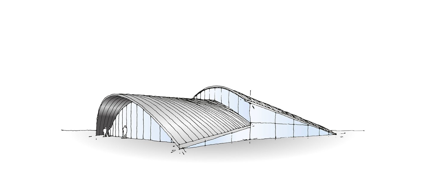 âDie Idee hinter meinem Entwurf war, die Bogenschale als Fassade wie auch als Dach einzusetzen, um so zwei Fliegen mit einer Klappe zu schlagen. Folglich habe ich den Bogen vom Dach ĂŒber die Fassade hinuntergezogen. Zudem erzeugen die im Objekt vereinten GegensĂ€tze von rund und eckig eine architektonische Spannung.â