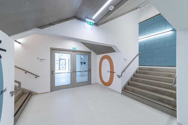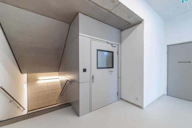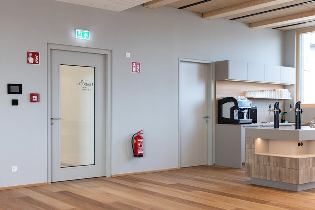 Das Herzstück der Brandschutzmassnahmen bilden langlebige Stahltüren im Stiegenhaus, die mit grossflächigen Glasausschnitten für ein helles und offenes Ambiente sorgen. Diese Türen erfüllen die Anforderungen der Klasse EI230-C und verbinden Schutz mit Transparenz.