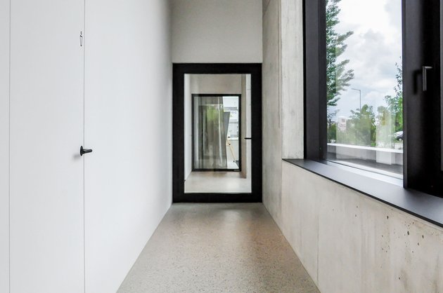 Die speziellen Anforderungen des Projektes erforderten massgeschneiderte Lösungen. Zutrittskontroll-Terminals wurden geschickt am Türstock angebracht und direkt ins Profil integriert, was zur modernen und aufgeräumten Ästhetik des Gebäudes beiträgt. Mattschwarze Alu-Beschläge und Profilzylinder verschwinden sichtlich in den Profilen und unterstreichen die moderne Architektur. Die unterschiedlichen Wandanschlüsse von Sichtbeton und Putz erforderten einen grau-weissen Mix an Wandverfugungen am gleichen Element.