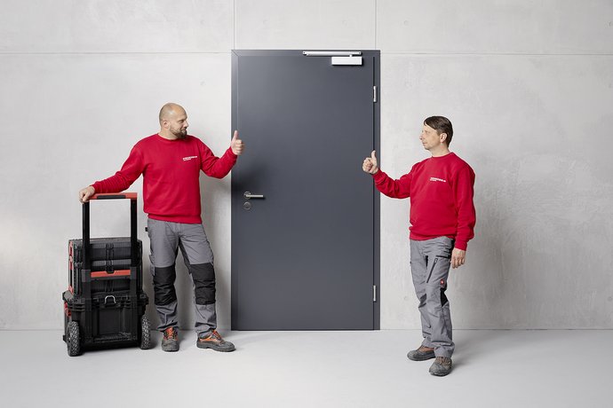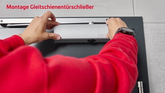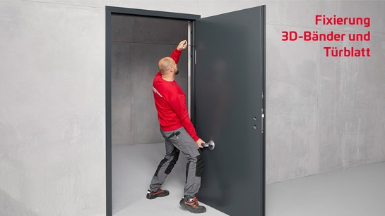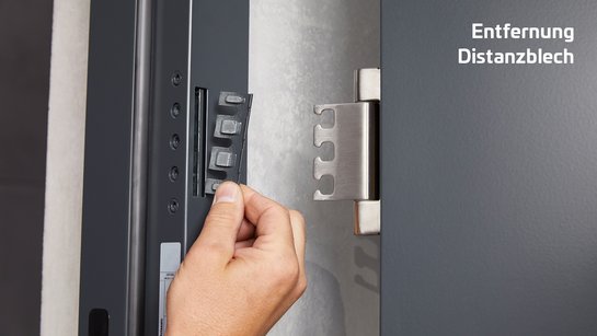 - Die Bandunterkonstruktion wird geöffnet, Distanzblech entfernt, Türblatt eingehängt und fixiert