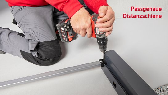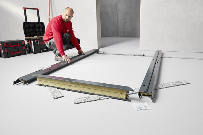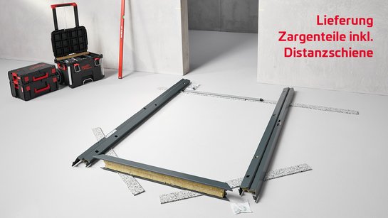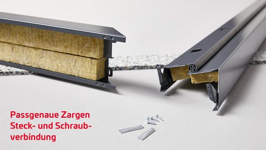 - Die drei Zargen-Teile werden passgenau mittels Steckbolzen verbunden und verschraubt, eine Distanzschiene gewährleistet die Stabilität der Zarge beim Einbau