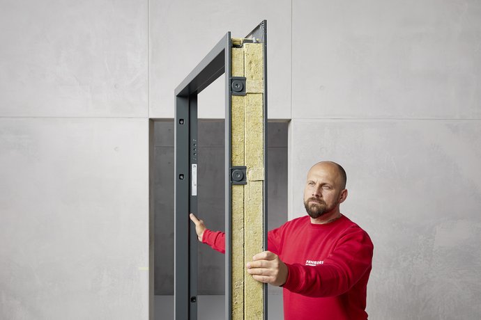 Unsere Peneder Zargen sind werksseitig gemäß DIBt-Zulassung mit Steinwolle hinterfüllt, somit ist kein Ausmörteln vor Ort notwendig. Durch die einzigartige Zargen Steck- und Schraubverbindung sowie die tiefenverstellbaren Montagebuchsen, kann die Tür exakt in der Maueröffnung ausgerichtet und fixiert werden.