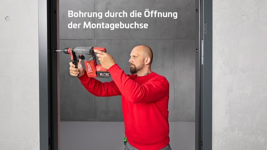 - Durch die einzigartige, tiefenverstellbare Montagebuchse wird die Zarge in der Maueröffnung ausgerichtet, rasch fixiert und zur Dübelmontage vorbereitet