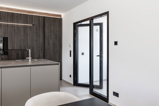 Das Friseurstudio Elite in Villach steht für modernes Design und ein exklusives Ambiente, das Kunden ein stillvolles Wohlfühlerlebnis bietet. Im Einklang mit diesem Anspruch setzt die PENEDER HIGHLINEflat ein ästhetisches Highlight und sorgt gleichzeitig für zuverlässigen Schutz. Die beidseitige, flächenbündige Multifunktionstür passt perfekt zum modernen und klaren Design des Salons und lässt den Raum heller und offener wirken. Dabei vereint sie wichtige Sicherheitsfunktionen wie Brand-, Rauch- und Schallschutz in einem dezenten Design. Für den Brandabschnitt zwischen Küche und Liftraum wurde eine schwarze Rohrrahmentür aus Alu-Glas verbaut. Diese einflügelige Tür mit Seitenteilen und eleganten, schwarzmatten Beschlägen bietet eine moderne Optik und erfüllt zugleich höchste Sicherheitsanforderungen.