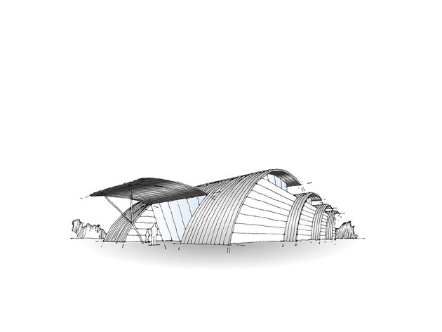 "In this design, I pulled the arched shell over the wall to create sense of tension between the roof, wall and terrain. By opening up the roof element, it also functions as a skylight. I pulled the arched shell over the long wall to use it as a dividing element. This creates an interesting tension between the wall and the roof for the viewer."